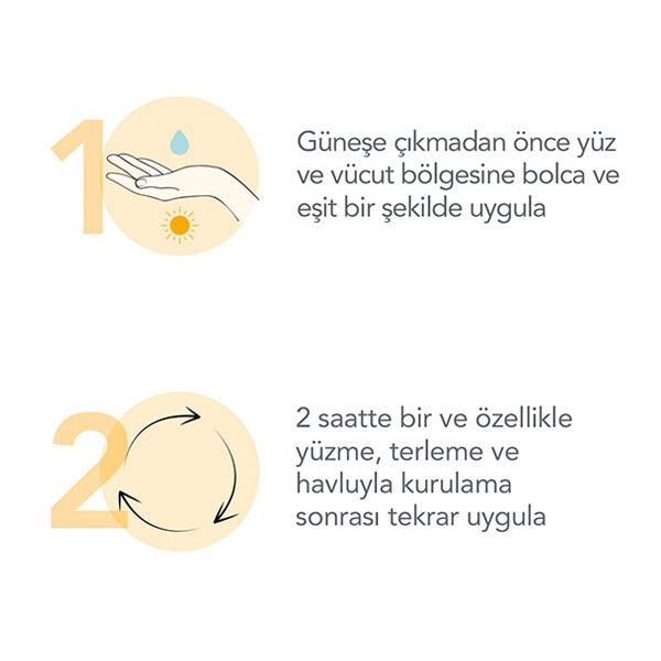 Güneşe çıkmadan önce yüz ve vücut bölgesine bolca ve eşit bir şekilde uygulayınız.