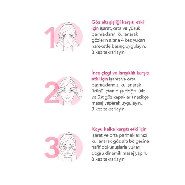 Hafif masaj eşliğinde, temizlenmiş göz çevresine uygulayınız. Günde 1 veya 2 kez uygulanabilir.