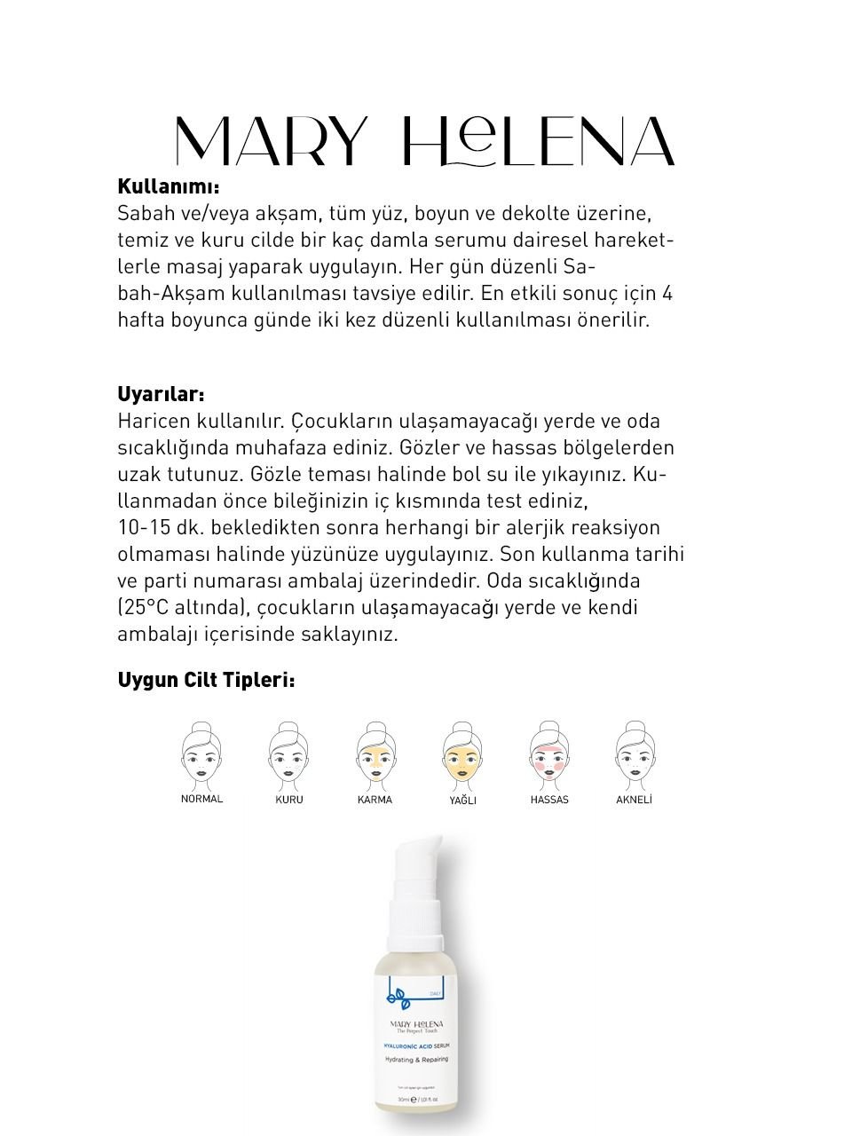 Mary Helena Hyaluronic Acid Serum, cildi derinlemesine nemlendirip, cilt yüzeyini pürüzsüzleştirmeye ve elastikiyetini artırmaya yardımcı etkili bir serumdur.
