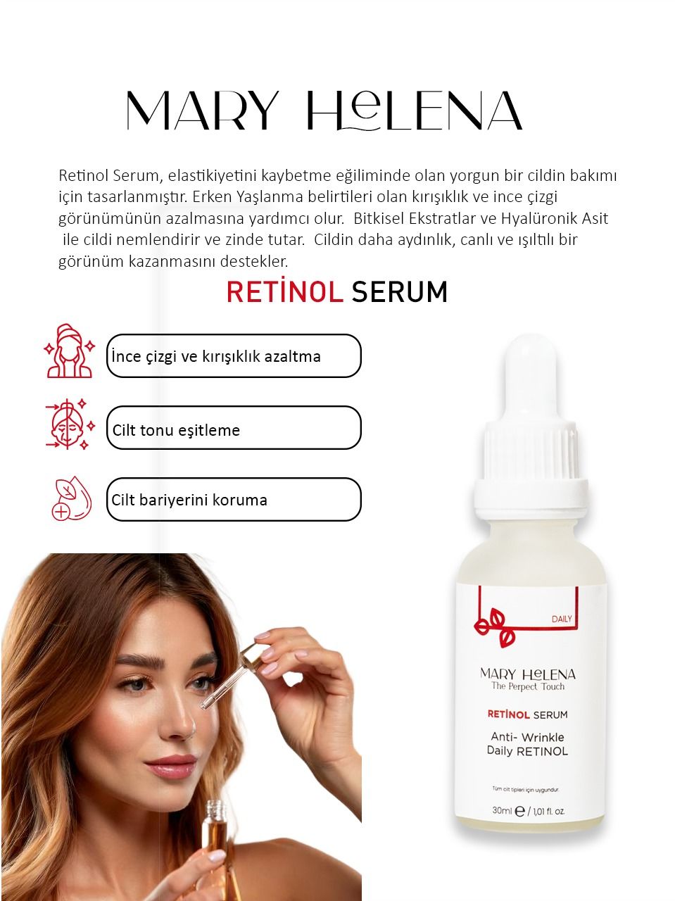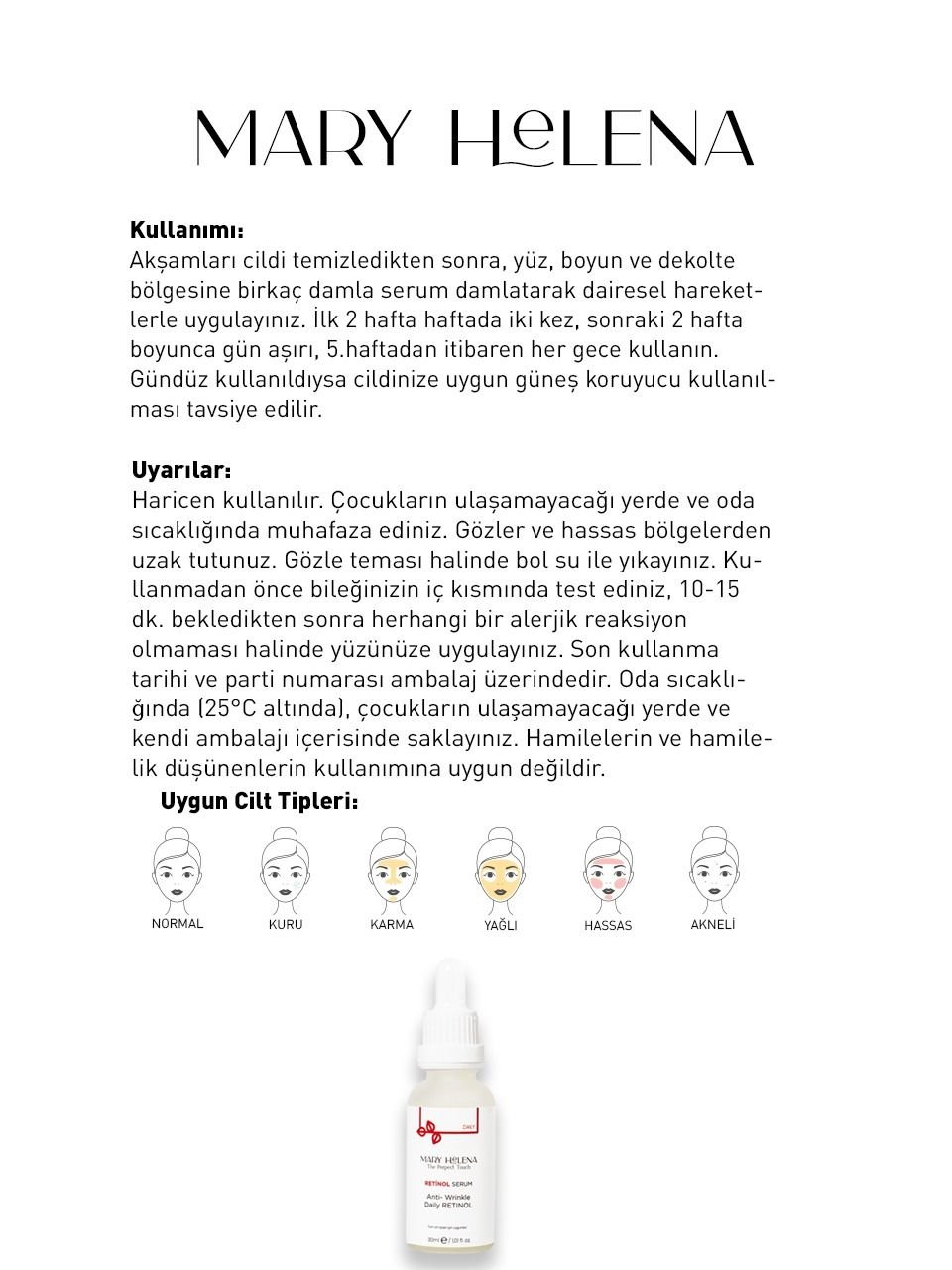Mary Helena Retinol Serum, elastikiyetini kaybetme eğiliminde olan yorgun bir cildin bakımı için tasarlanmıştır.