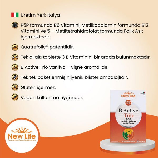 İçerdiği P5P formunda B6, metilkobalamin formda B12, metilfolat kombinasyonu ve dil altı tablet formu sayesinde Türkiye’ de ilk ve tektir.
