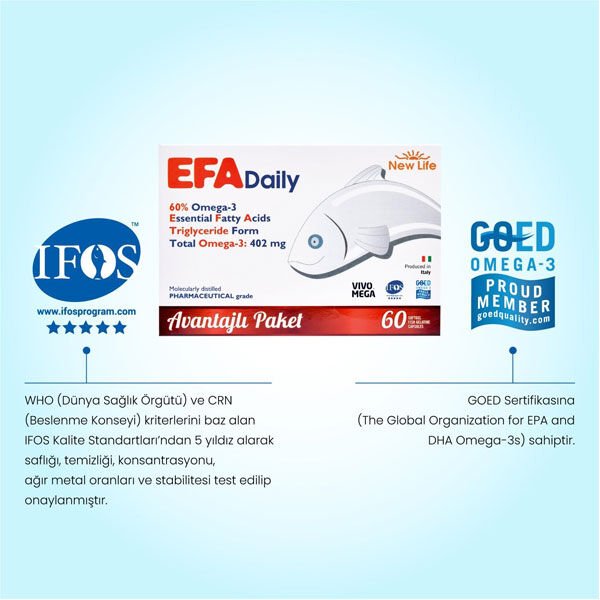 WHO (Dünya Sağlık Örgütü) ve CRN (Beslenme Konseyi) kriterlerini baz alan IFOS Kalite Standartları’ndan 5 yıldız alarak saflığı, temizliği, konsantrasyonu, ağır metal oranları ve stabilitesi test edilip onaylanmıştır.