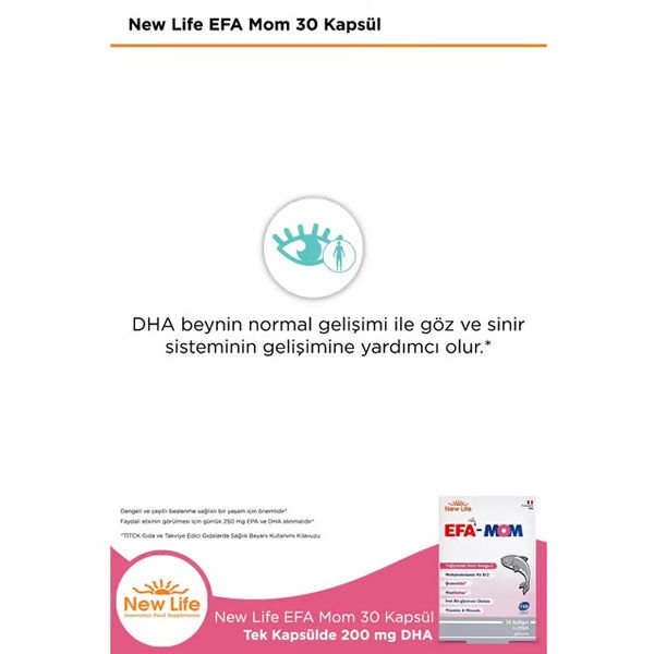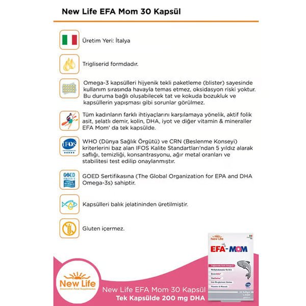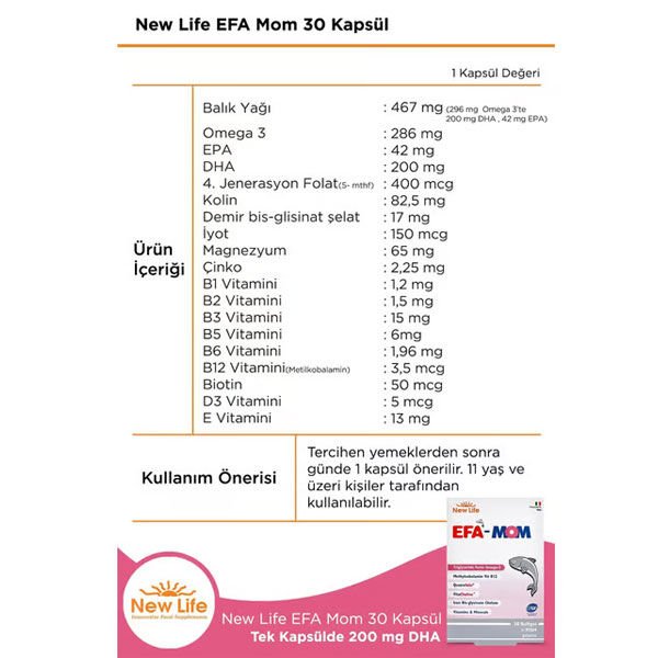 Türkiye de ilk ve tek olan, çok yönlü, yüksek etkili ve farklı içerikleriyle gebelik dönemi öncesindeki, gebelik dönemi sırasındaki ve emzirme dönemindeki aynı zamanda bütün kadınların DHA omega-3 yağ asidi, vitamin ve mineral ihtiyaçlarının karşılanmasına yardımcı olur.