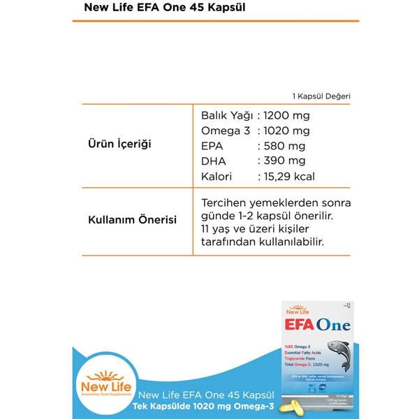 EFA One, tek kapsülde oldukça yüksek konsantrasyonda omega-3 içeriğine sahiptir. Tek kapsülde 1020mg (1 gram) omega-3 yağ asidi içermektedir.