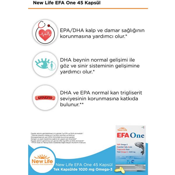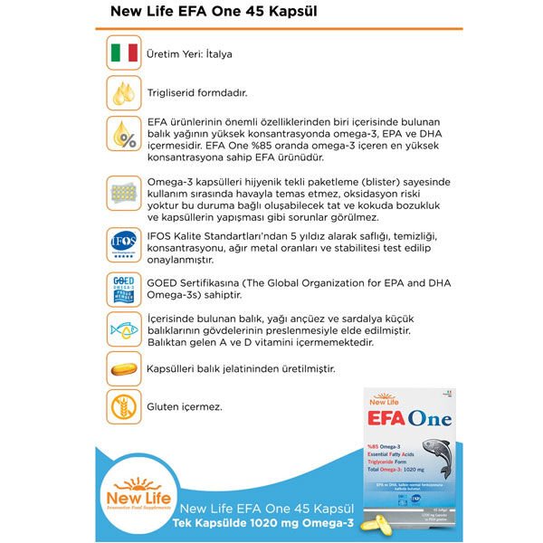 EFA One %85 oranda omega-3 içeren en yüksek konsantrasyona sahip EFA ürünüdür.