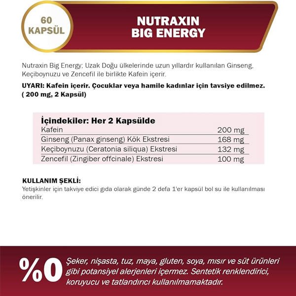 Nutraxin Big Energy, enerji üretimini destekleyen güçlü içeriklerle formüle edilmiştir: