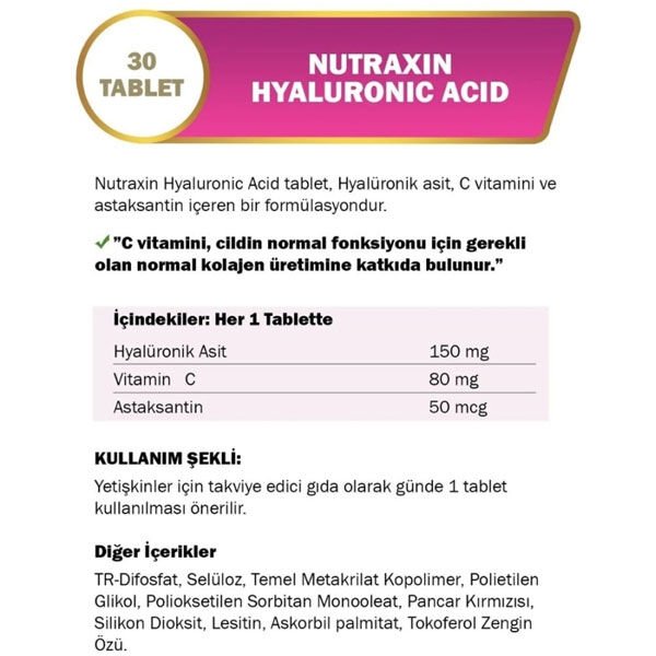 Nutraxin Hyaluronik Asit Takviye Edici Gıda 30 Tablet İçeriği