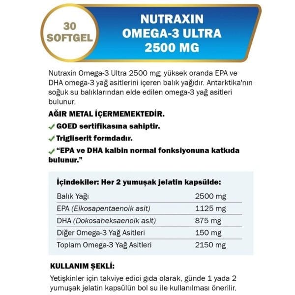 Nutraxin Omega 3 Ultra 2500 mg 30 Yumuşak Kapsül, yüksek kaliteli omega-3 yağ asitleri içerir ve vücuda sağladığı faydalarla öne çıkar: