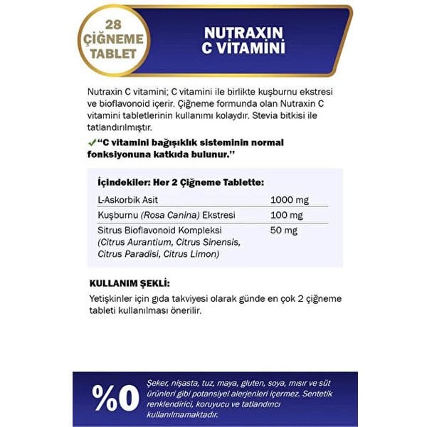 Nutraxin Vitamin C 1000 mg Takviye Edici Gıda, bağışıklık sistemini desteklemek ve antioksidan etkiler sunmak için formüle edilmiş bir takviye edici gıdadır. Yüksek miktarda C vitamini içeren bu tabletler, vücudun ihtiyaç duyduğu günlük C vitamini desteğini sağlar. Ayrıca, C vitamini yorgunluk ve bitkinliğin azalmasına yardımcı olabilir.