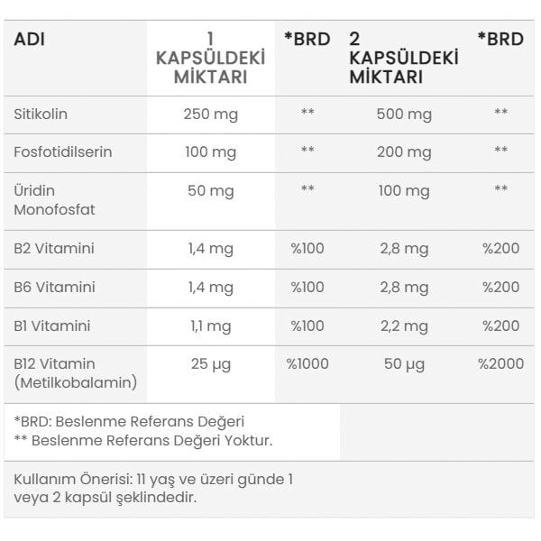 Kullanım Önerisi: 11 yaş ve üzeri günde 1 veya 2 kapsül şeklindedir.