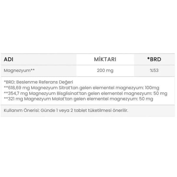 Ürün Bileşimi: Magnezyum sitrat, magnezyum malat, magnezyum bisglisinat, hacim arttırıcı (mikrokristalin selüloz, dikalsiyum fosfat), sertleştirici (polivinilprolidon), emülgatör (yağ asiterinin magnezyum tuzları, çapraz bağlı sodyum karboksi metil selüloz, silikon dioksit)