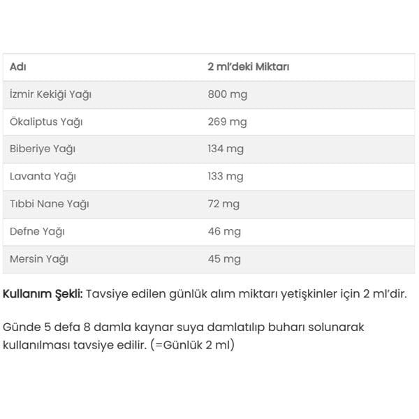 Günde 5 defa 8 damla kaynar suya damlatılıp buharı solunarak kullanılması tavsiye edilir. (=Günlük 2 ml)