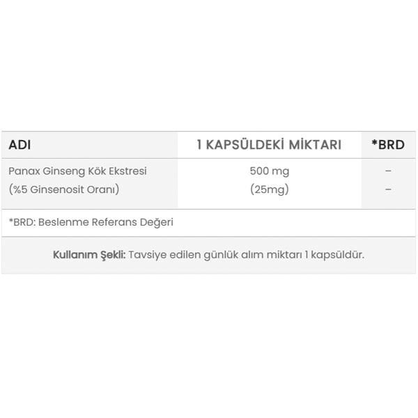 Ocean Panax Ginseng, her kapsülünde 500 mg panax ginseng kök ekstresi ve 25 mg ginsenosit içeren bir gıda takviyesidir.