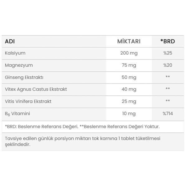 Vitex Agnus Castus, Vitis Vinifera, Ginseng, Kalsiyum, Magnezyum ve B6 Vitamini içeren ve kadınların kullanımı için geliştirilmiş bir gıda takviyesidir.