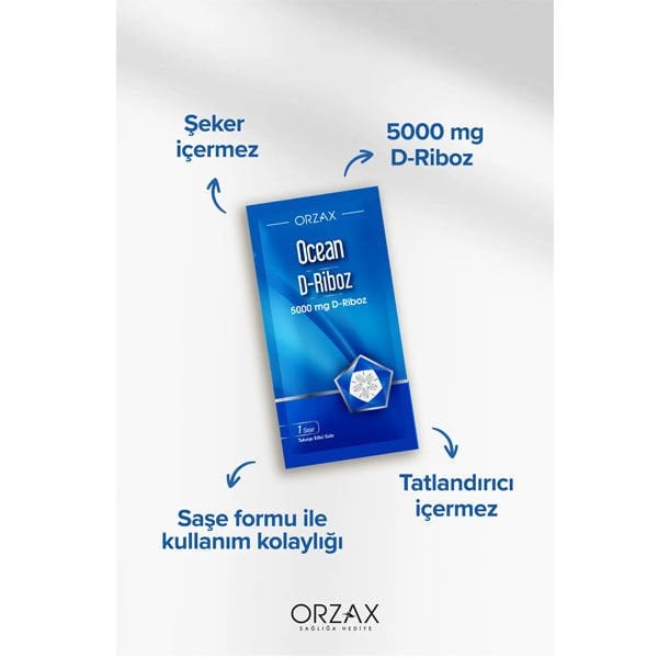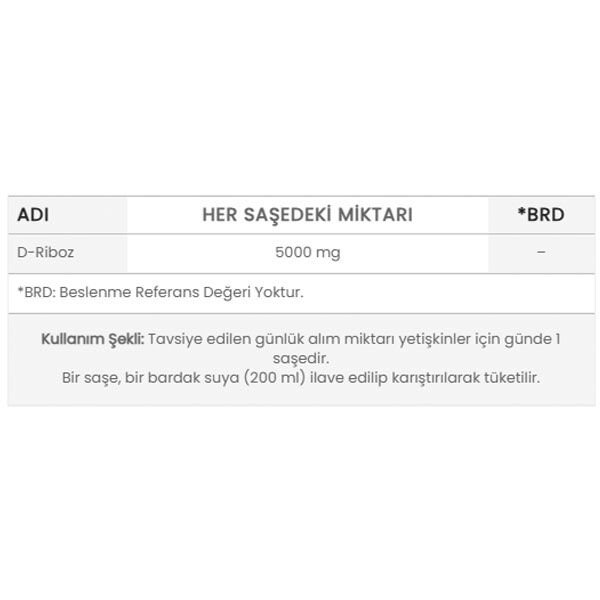 Her bir saşe içerisinde 5000 mg D-Riboz içeren gıda takviyesidir.