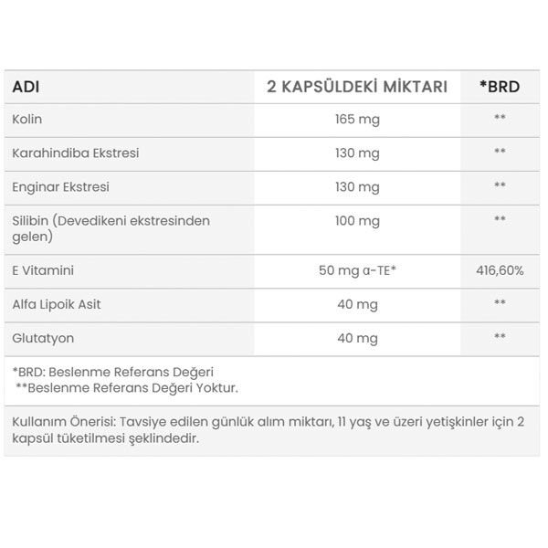 Kullanım Önerisi: Tavsiye edilen günlük alım miktarı, 11 yaş ve üzeri yetişkinler için 2 kapsül tüketilmesi şeklindedir.