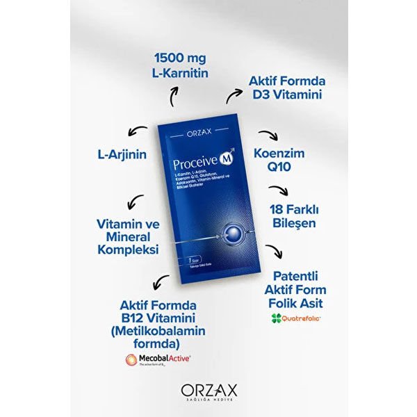 Proceive M, optimum fizyolojik oranda L-karnitin, L-arjinin, vitamin, mineral ve bitkisel ekstreler içeren gıda takviyesidir.