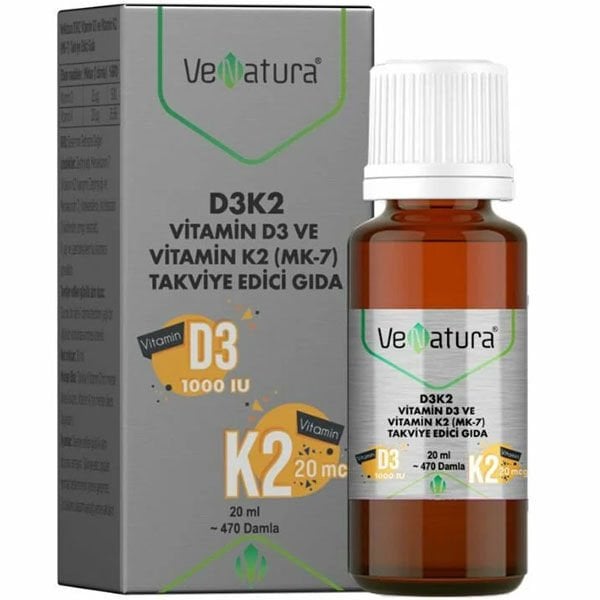 VeNatura Vitamin D3K2 Takviye Edici Gıda 20 ml, D vitamini ve K2 vitamini içeren sıvı formda bir takviyedir. D vitamini, vücudun bağışıklık sistemini desteklemeye yardımcı olabilir ve kemik sağlığını iyileştirebilirken, K2 vitamini ise kalsiyumun doğru bir şekilde kemiklere yönlendirilmesine yardımcı olabilir. Bu takviye, özellikle vitamin D3 ve K2 eksikliklerini gidermek isteyenler için ideal bir çözümdür.